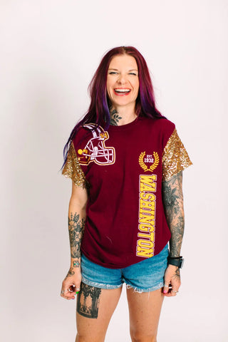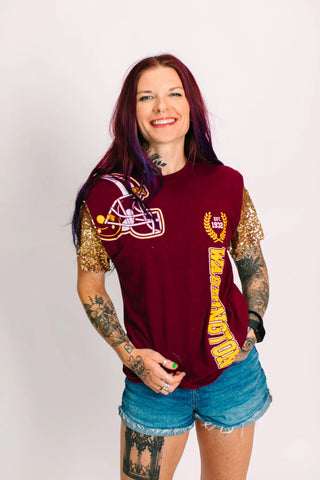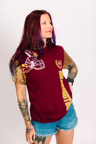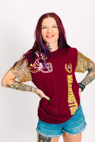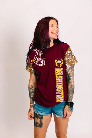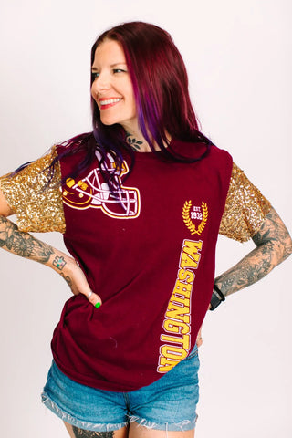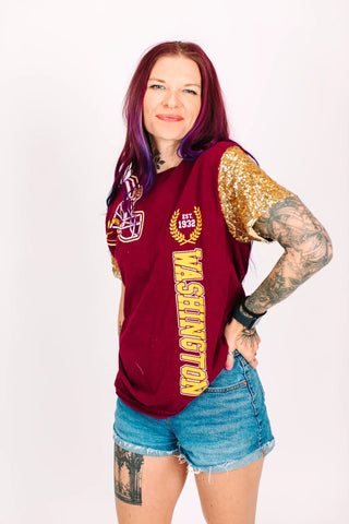 Be the life of the party with our party tees. These shirts got a glow-up with some sequin sleeves patterned from the original to ensure a perfect fit. Get ready to party in our sequin sleeve party tee!